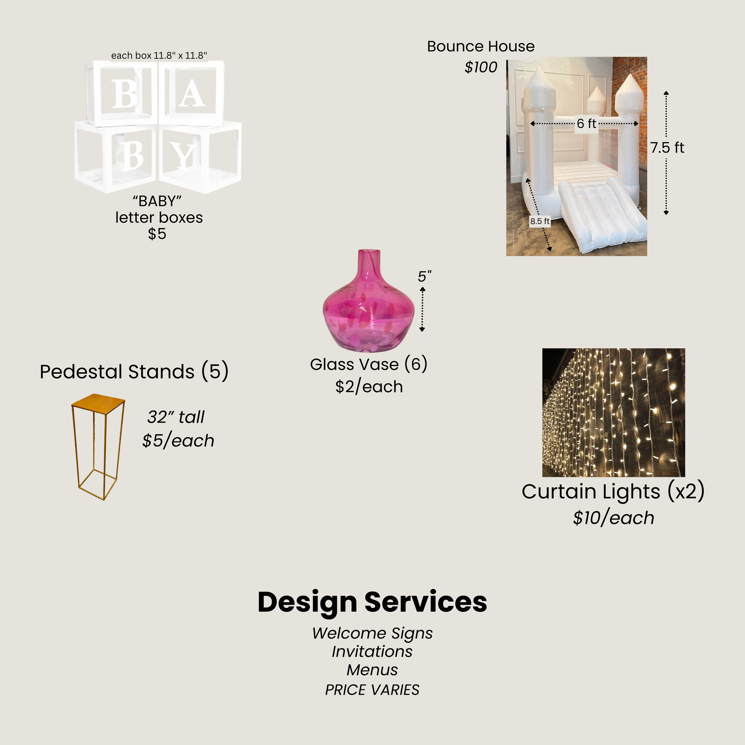 Rentals must be confirmed 10 days before event.